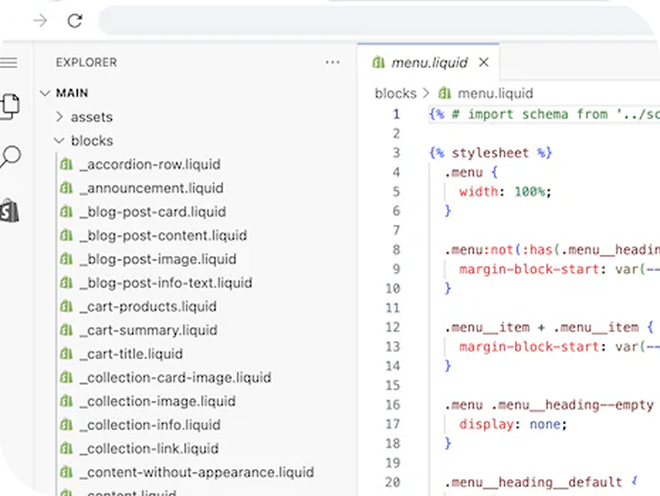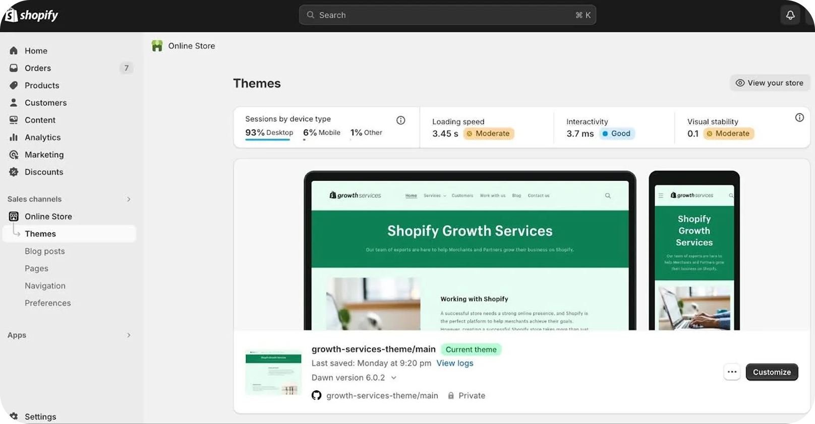 When setting up your Shopify store, you generally have two paths to choose from. The first is using a free or premium pre-built theme from Shopify’s theme library and customizing it to suit your brand. These themes can be adjusted through Shopify’s built-in editor or further modified using code (CSS, CLI, or Liquid).
