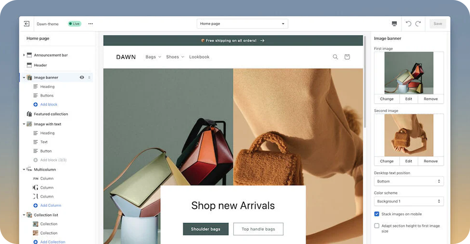 A pre-made Shopify theme is a ready-to-use template you can install directly into your store. Shopify offers hundreds of options, including free themes developed by Shopify and paid themes designed by third-party creators. For example, the Dawn theme is a popular, free option that is easy to set up, mobile-friendly, and customizable with a drag-and-drop editor.